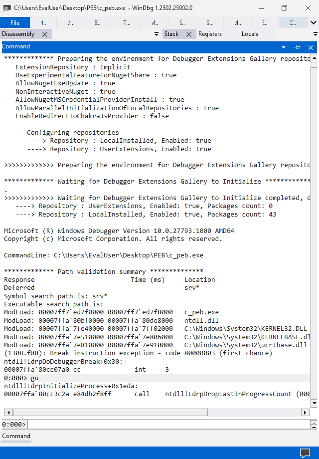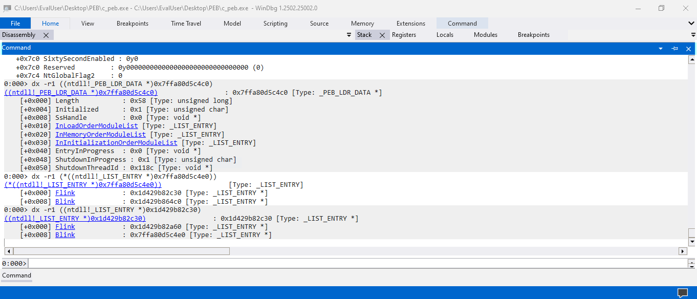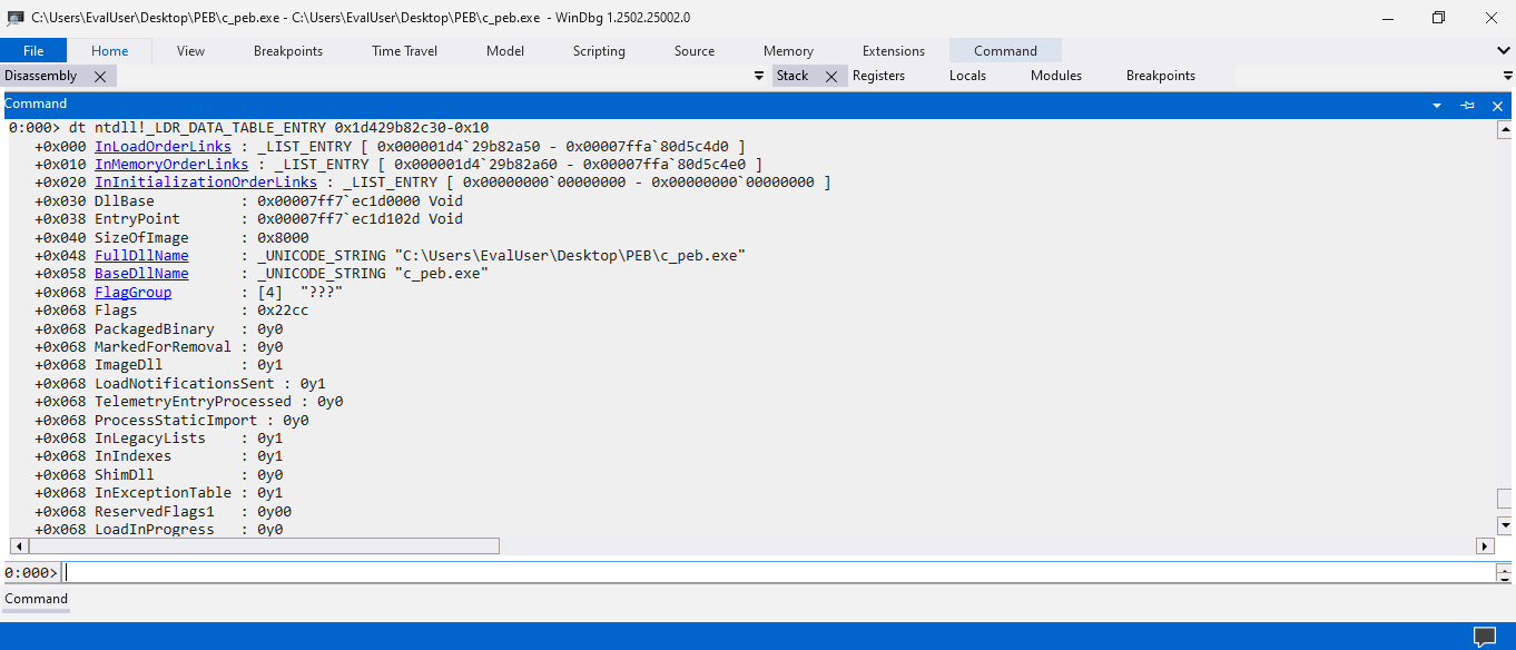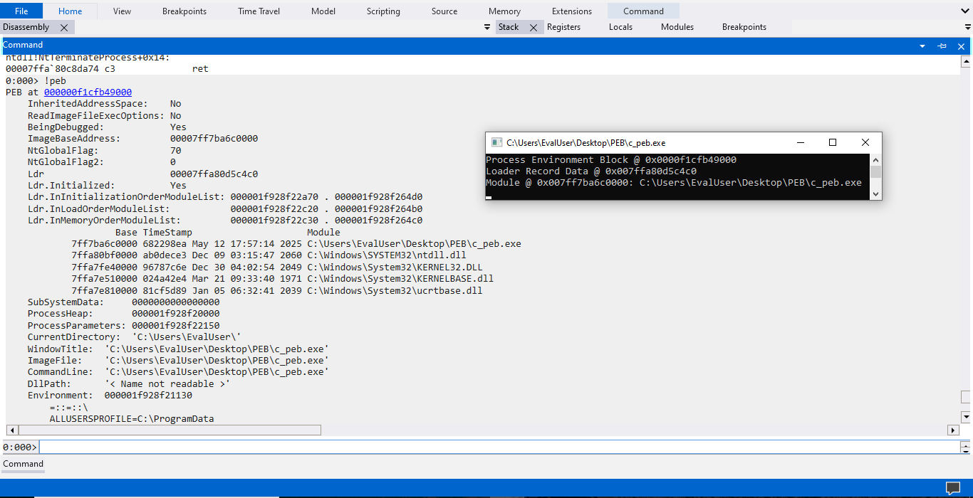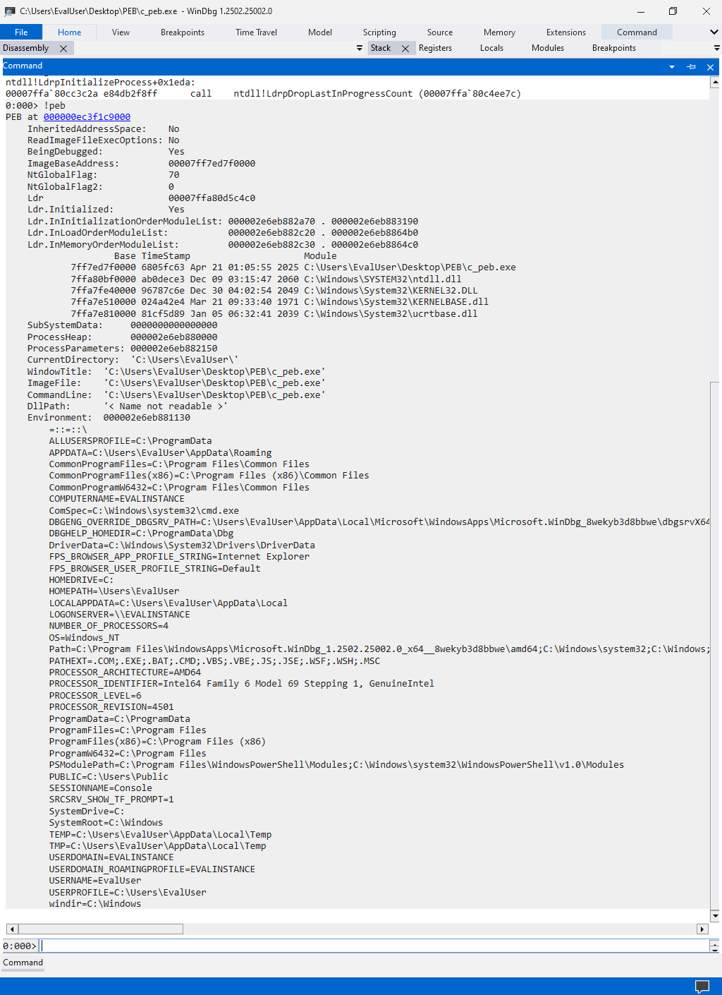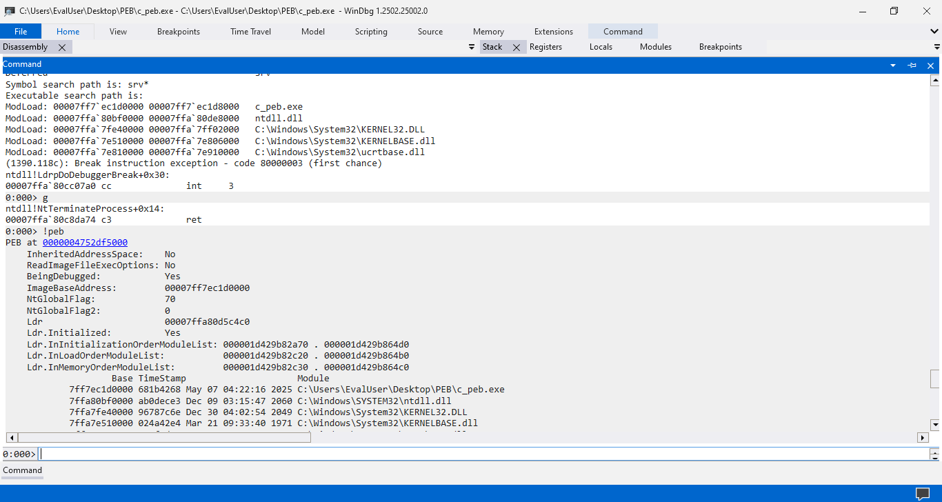 Here, we stop at the exit breakpoint, which is triggered when the program under debugging is about to exit. This exit breakpoint allows us to capture the complete console output from the program while preserving the runtime context. We can examine the Process Environment Block (PEB) and the loaded modules without worrying about relocations. We inspect the PEB using the !peb general extension command.