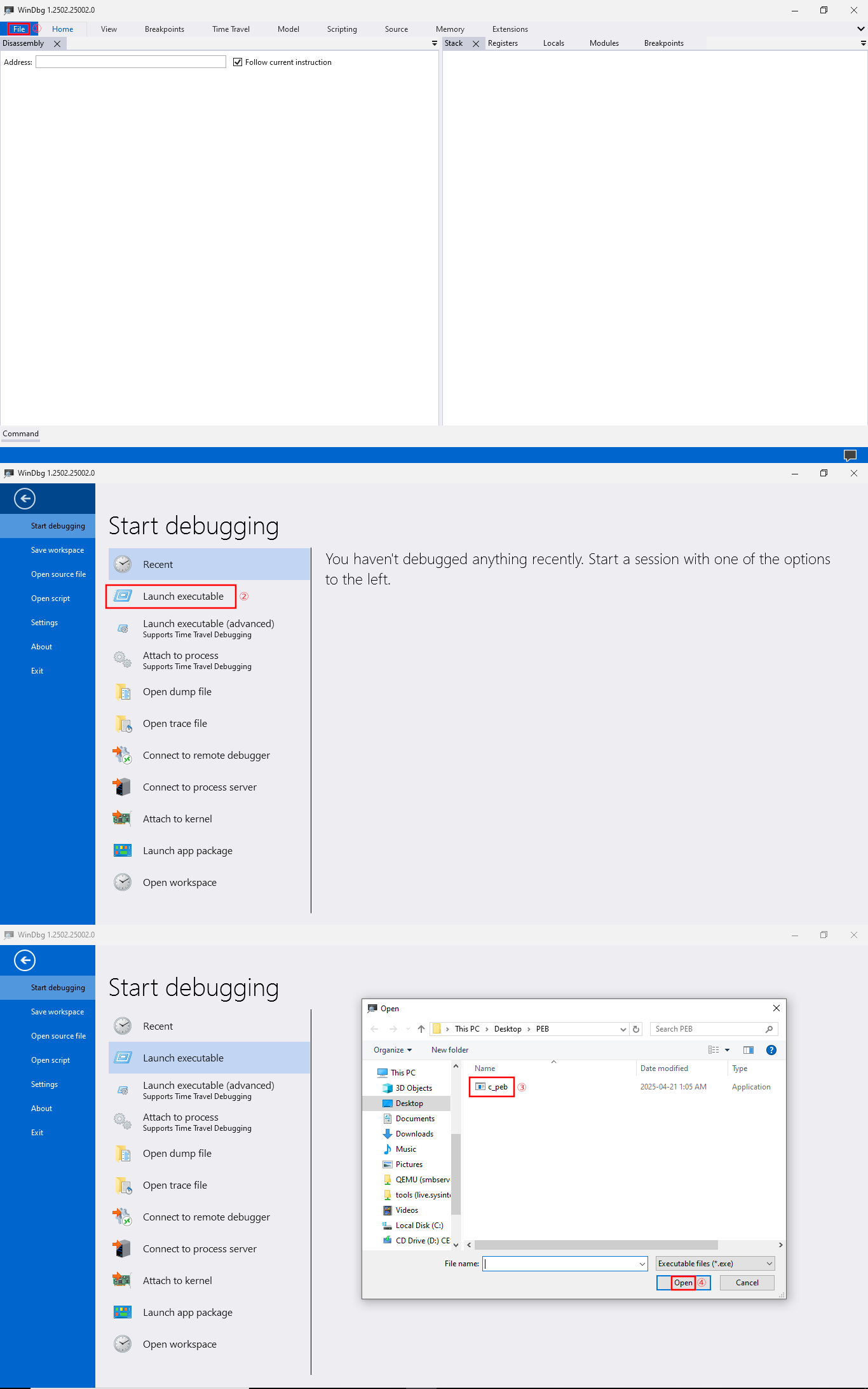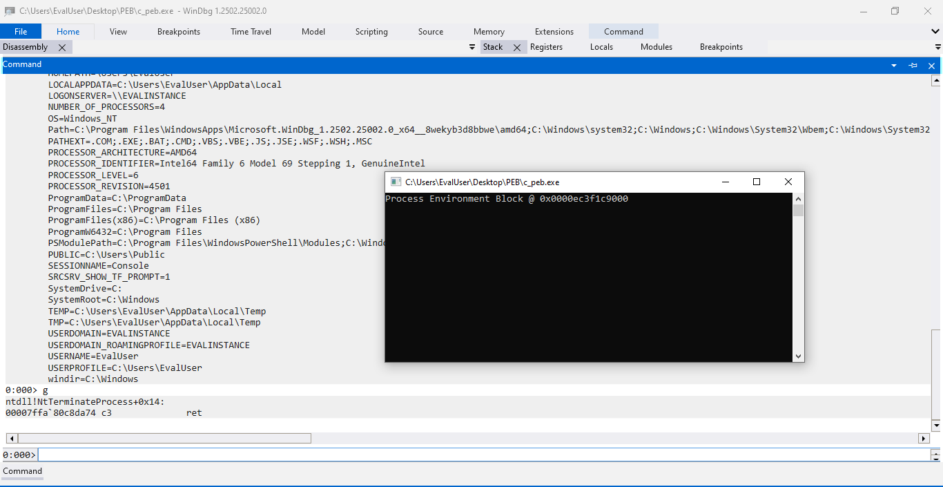 The final executable, c_peb.exe, prints a hexadecimal address, claiming it’s the address of the PEB. Can we verify the correctness of the so-called PEB address? Indeed, we could attach a debugger to the process and inspect the PEB address within the debugger. Here we go; let’s do this with the most authentic Microsoft debugger that ships with the Windows operating system—WinDbg.
