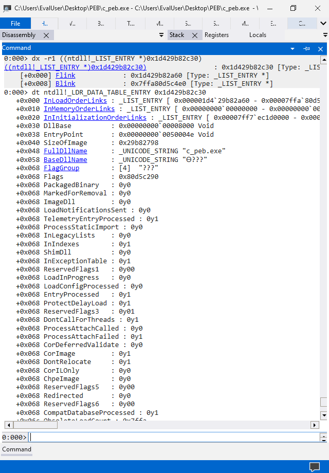With the same logic as in our small program, we follow the Ldr field in the PEB structure and reach the PEB_LDR_DATA structure in the debugger. We could click the in-place links from the command outputs. We then click the InMemoryOrderModuleList link and the Flink link, hoping to reach the LDR_DATA_TABLE_ENTRY structure pointed by the Flink field.