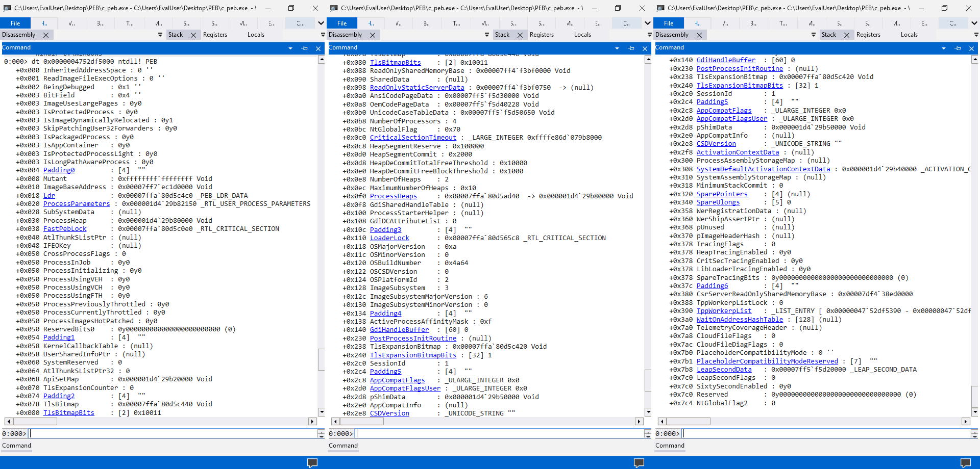 Some may complain that the PEB address provided by WinDbg differs from the previous program output 0x000047546ac000. This is expected, given that relocation happens between different process creations. Therefore, the PEB relocates to a different address when we rerun the program under the debugger. If we hit the g command, which resumes the program’s execution, letting it hit the process exit system breakpoint, we could see that the program printed PEB address is identical to what the debugger suggested.