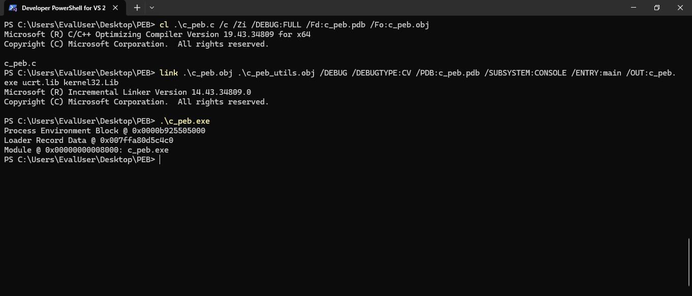 1 | PS C:\Users\EvalUser\Desktop\PEB> ml64 .\c_peb_utils.asm /c /Fo:c_peb_utils.obj |
